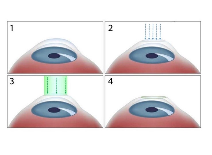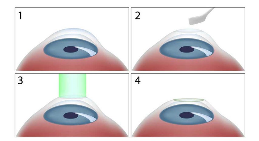 Göz bebeğinin önündeki şeffaf dokuya kornea denir. PRK yönteminde korneanın en üst tabakası (epitel tabaka) metal bir cerrahi alet yardımı ile manuel olarak kazınır (Resim2). Açığa çıkan kornea tabakasına göz derecesini düzelten lazer yapılır (Resim 3). Operasyon sonrasında 3-5 gün içinde göz yüzeyinde kalan epitel hücreleri çoğalarak iyileşme sağlanır. Bu süre zarfında terapotik kontakt lens korneaya konulur.  Kornea iyileşmesi tamamlanınca bu lens çıkartılır. İşlem sonrasında damlaların damlatılması ve güneşli havalarda güneş gözlüğü takılması tavsiye edilir.